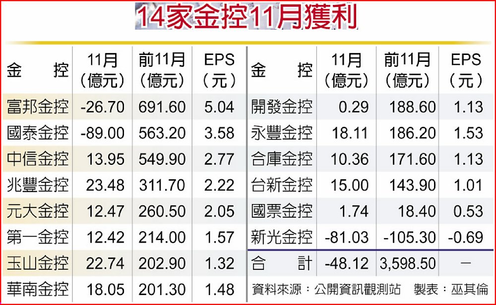 14家金控11月合計稅後虧損48.12億元,創今年以來最低,較10月少逾300億元,累積前11月合計稅後獲利為3,599億元,仍較去年同期成長16%。