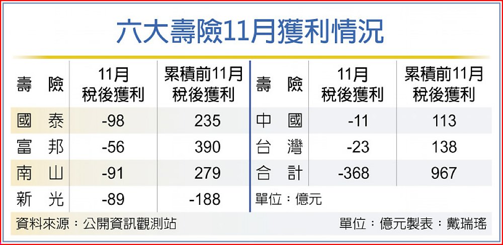 六大壽險即國泰、富邦、南山、新光、中國及台灣人壽,資產約占整體壽險79%,11月即便有公司緊急拉升避險比重,但因新台幣急升,六大壽險全數出現單月虧損,重演去年11月情況。