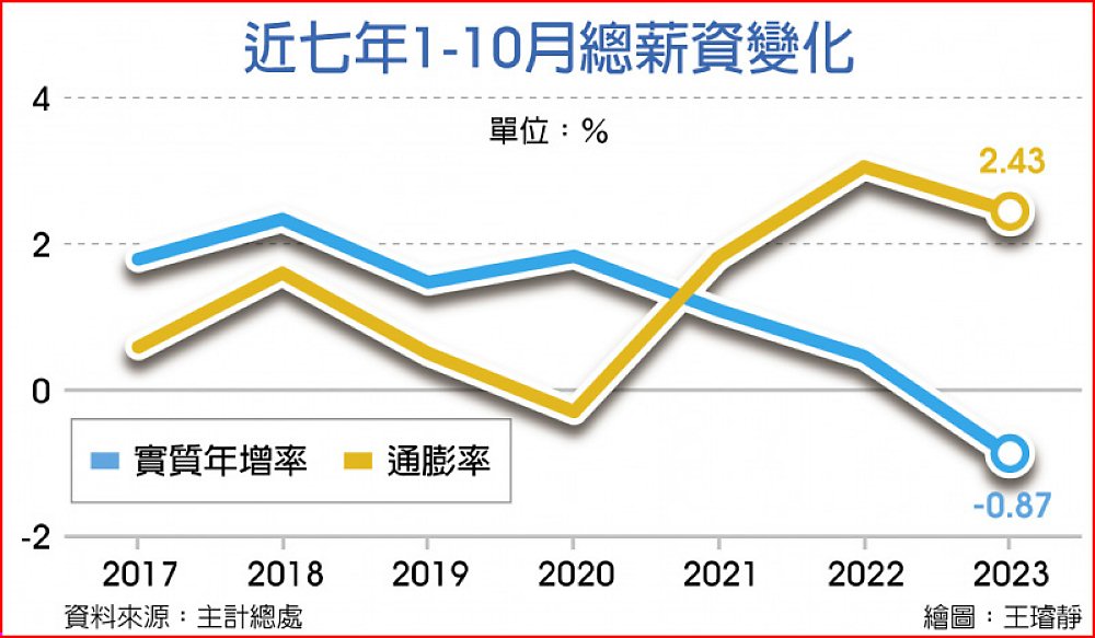國勢普查處副處長陳惠欣表示,去年下半年以來的這一波全球景氣趨緩,仍持續影響國內勞動市場,以製造業受影響最大,由於出口疲弱抑制績效獎金發放,使得今年1~10月總薪資年增率降至1.53%,創下近三年最低,經同期通膨率2.43%平減後,實質總薪資年減0.87%,為近七年同期首度負成長。