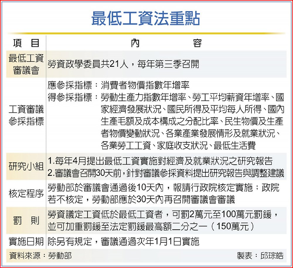 《最低工資法》分六大重點、19個條文,包括設置最低工資審議會、明確審議參採指標、審議程序與行政院核定程序、研究小組先行評估機制、與罰則,以及與基本工資制度順利接軌等重要規定