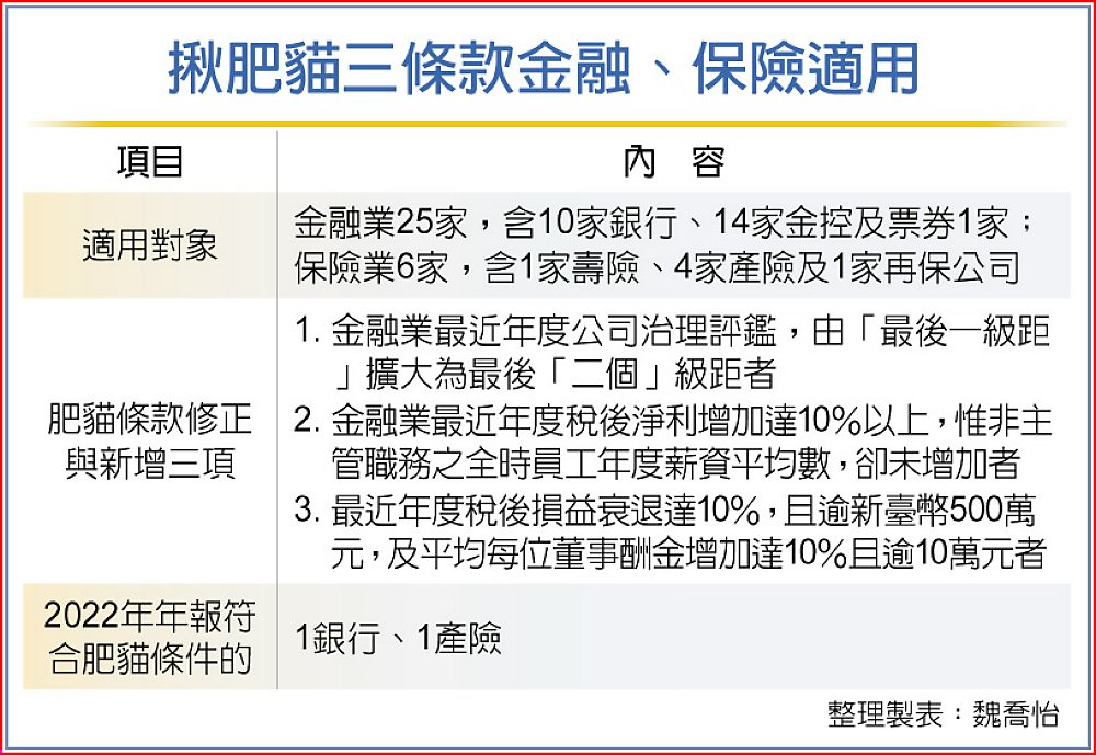 金管會揪肥貓,擴大到金融業,繼11月修正擴大上市櫃公司董事酬金揭露條件後,12日公布金融業)及保險業亦比照適用,對公司評鑑低分、虧損卻替董監加薪、賺錢卻虧待員工的公司,要求全都露。圖/本報資料照片