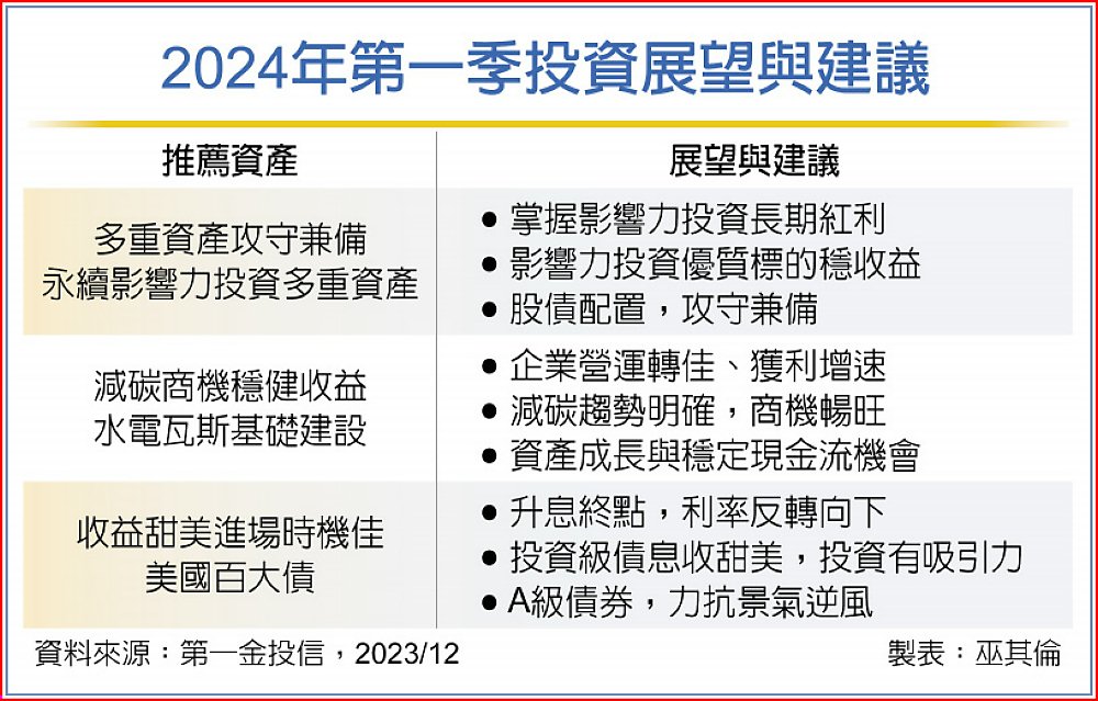 建議藉由多重資產配置,挑選影響力投資優質標的,掌握攻守兼備優勢,亦可挑選防禦類型股票,如水電瓦斯公用事業股,近期全球投入減碳、淨零轉型投資,帶動龐大投資商機。