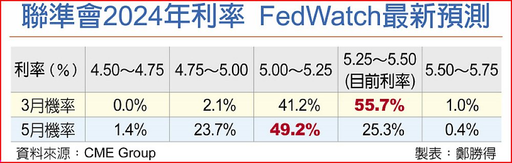市場原先預期Fed最快明年3月便會轉向降息,但11月非農就業數據顯示勞動市場依然強勁,且同月消費者物價指數(CPI)月增0.1%略微回升,令投資人如今傾向相信5月才首度降息。