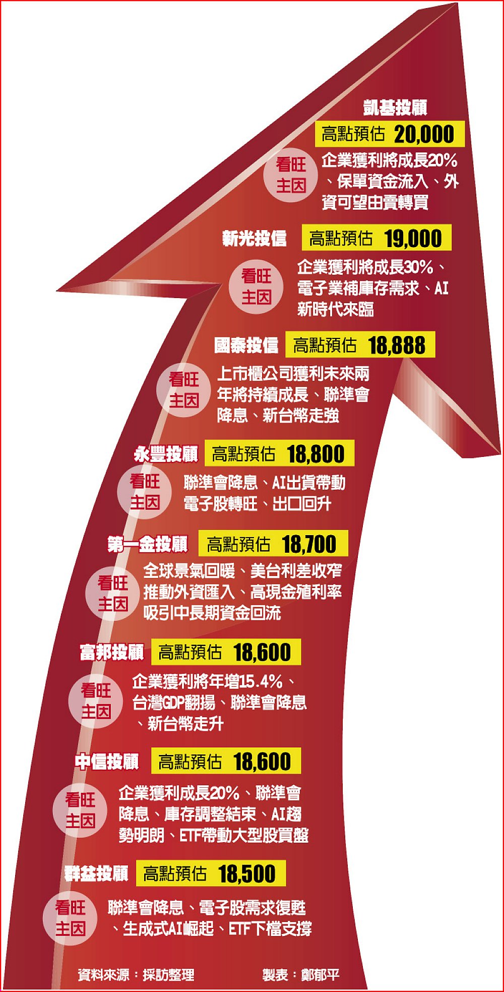 歲末年終各投資機構大顯神威,統計新光、國泰兩家投信,及凱基、永豐、第一金、富邦、中信、群益六家投顧,預測明年指數高點介於18,500點~20,000點間,顯示法人圈不約而同看好明年多頭大復甦,指數突破2022年1月5日締造的18,619點歷史新高可期。