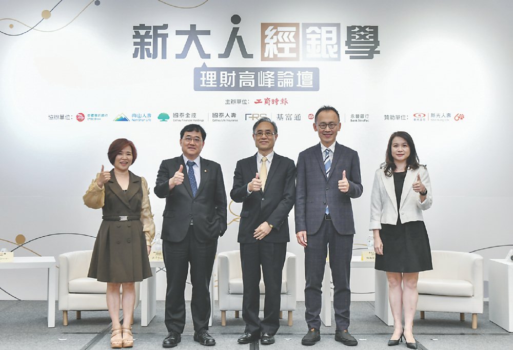 ●由工商時報主辦的「新大人經銀學」理財高峰論壇13日舉行,綜合座談邀請節目主持人楊月娥(左起)、新光醫院副院長洪子仁、保發中心董事長簡仲明、南山人壽資深副總經理陳維新及國泰人壽副總經理凃薏如等出席與談。圖/王德為