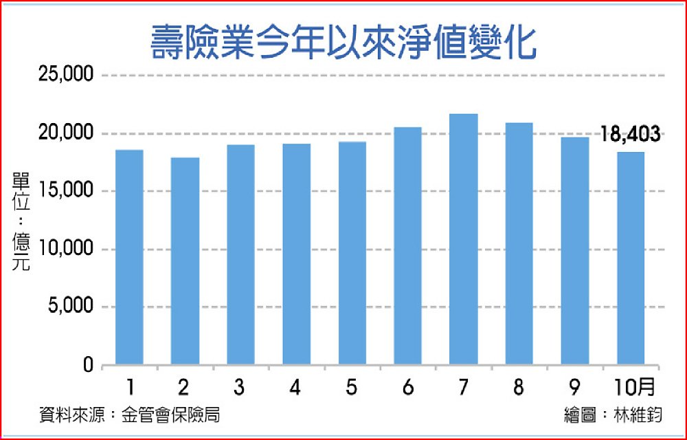 第三季股債雙跌,壽險業淨值9月跌破2兆元,當月美國10年期公債殖利率飆升到16年新高,股市也下跌,金融資產未實現損失擴大,第三季整體壽險業的金融資產未實現損失擴大到5.6兆元,創史上新高,10月情況持續,前六大壽險8月到10月淨值少逾3,000億元,整體壽險業淨值亦連三月下降,合計3,271億元,從7月底的2兆1,674億元,10月底降到1兆8,403億元,為近八個月新低。
