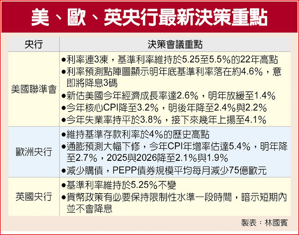 英央行宣布利率三連凍,政策利率維持在5.25%,警告對抗通膨仍有長路要走,利率須持續在高位一段時間。總裁貝利稱現在猜測降息還言之過早,不能說利率已到峰值。Principal資產管理公司策略師席哈(Seema Shah),相對於Fed的鴿派轉向,英國央行對利率的鷹派立場讓外界意外。(相關新聞見A2、A3)