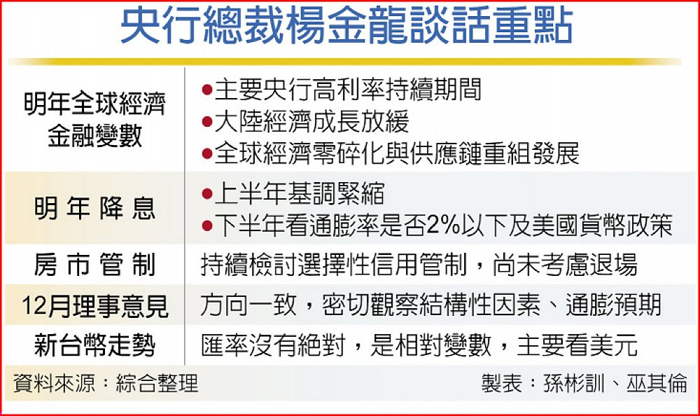 楊金龍指出,明年貨幣政策考量三大因素,一是主要經濟體貨幣政策動向,尤其Fed明年可能降息3碼最為關鍵;二是大陸經濟下行風險持續;三是關注國際原物料價格變化、地緣政治風險及極端氣候,央行將適時調整貨幣政策,並強調「物價還是最優先」,以維持物價穩定、金融穩定為主。