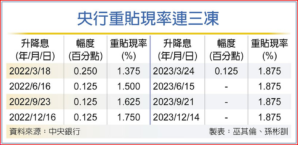 央行第四季理監事會決議,維持重貼現率、擔保放款融通利率及短期融通利率,分別是1.875%、2.25%和4.125%,央行這波緊縮似已近終結。楊金龍表示,這次決策相對「單純」,不用花長時間討論,全體理事立場一致,且都未提升息或降息議題。