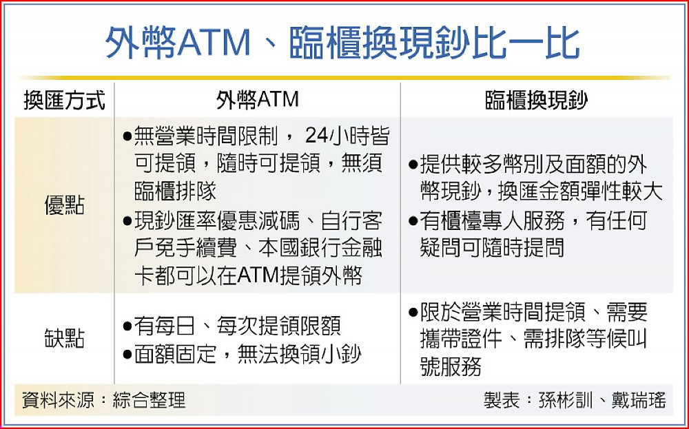 台新銀行主要針對自行客戶,在外幣ATM用台幣帳戶換匯提領,可以有換匯減碼優惠,美元減5分、日圓減0.1分、人民幣減0.7分、歐元減8分,也是免手續費。
