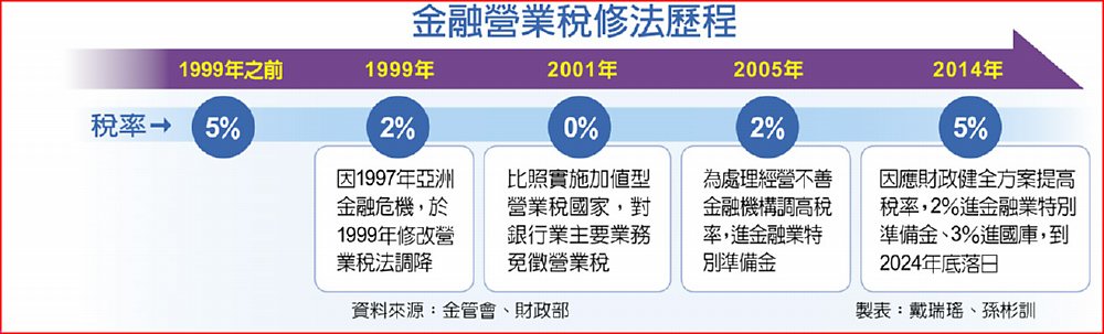 金融業營業稅稅率5%將在2024年底落日,各公會積極協助金融業爭取調降,如工商協進會理事長吳東亮、銀行公會理事長暨兆豐金董事長雷仲達都公開建議主管機關降稅率,總統蔡英文也承諾可進一步評估金融營業稅稅率,財政部部長莊翠雲日前則強調態度開放。據悉,金融營業稅率調降已逐漸達到共識。