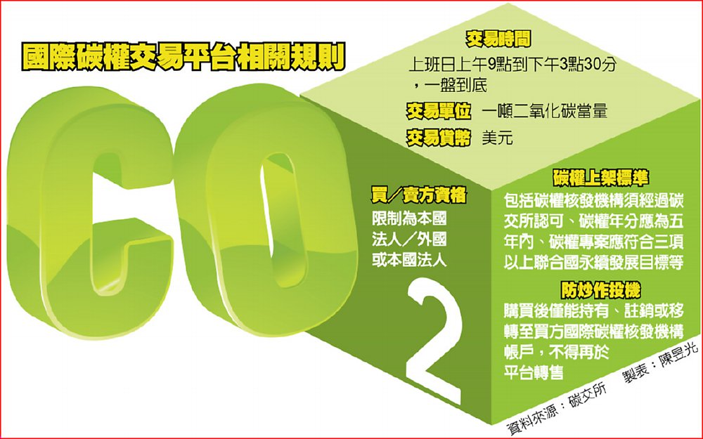 國內首次碳權交易,碳交所20日先行揭露交易規則。其中,國際碳權的買方以本國法人為限,賣方得為外國或本國法人;交易時間為平日上午9時至下午3時30分,假日休市;交易單位為一噸二氧化碳當量,交易貨幣為美金。