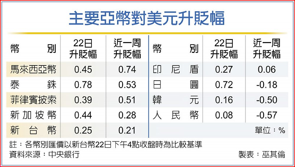 新台幣匯率22日開盤即上衝,最高升破1角衝到31.17元,創近五個月新高盤中價,終場升7.9分、31.203元作收,則為五個多月來收盤新高,總成交量14.765億美元。