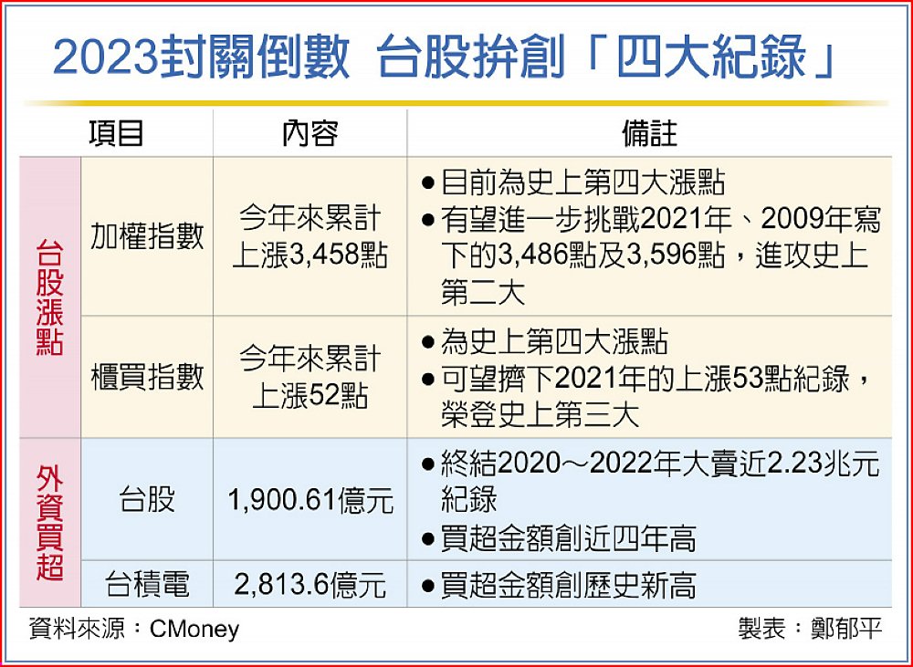 另外,籌碼面也是焦點,外資終結2020~2022年間,對台股提款2.23兆元的偏空操作,今年上半年大舉回補台股,高達3,741.88億元,儘管下半年賣多於買,但截至22日止的累計買超金額,仍有1,900.61億元,為四年來最高。