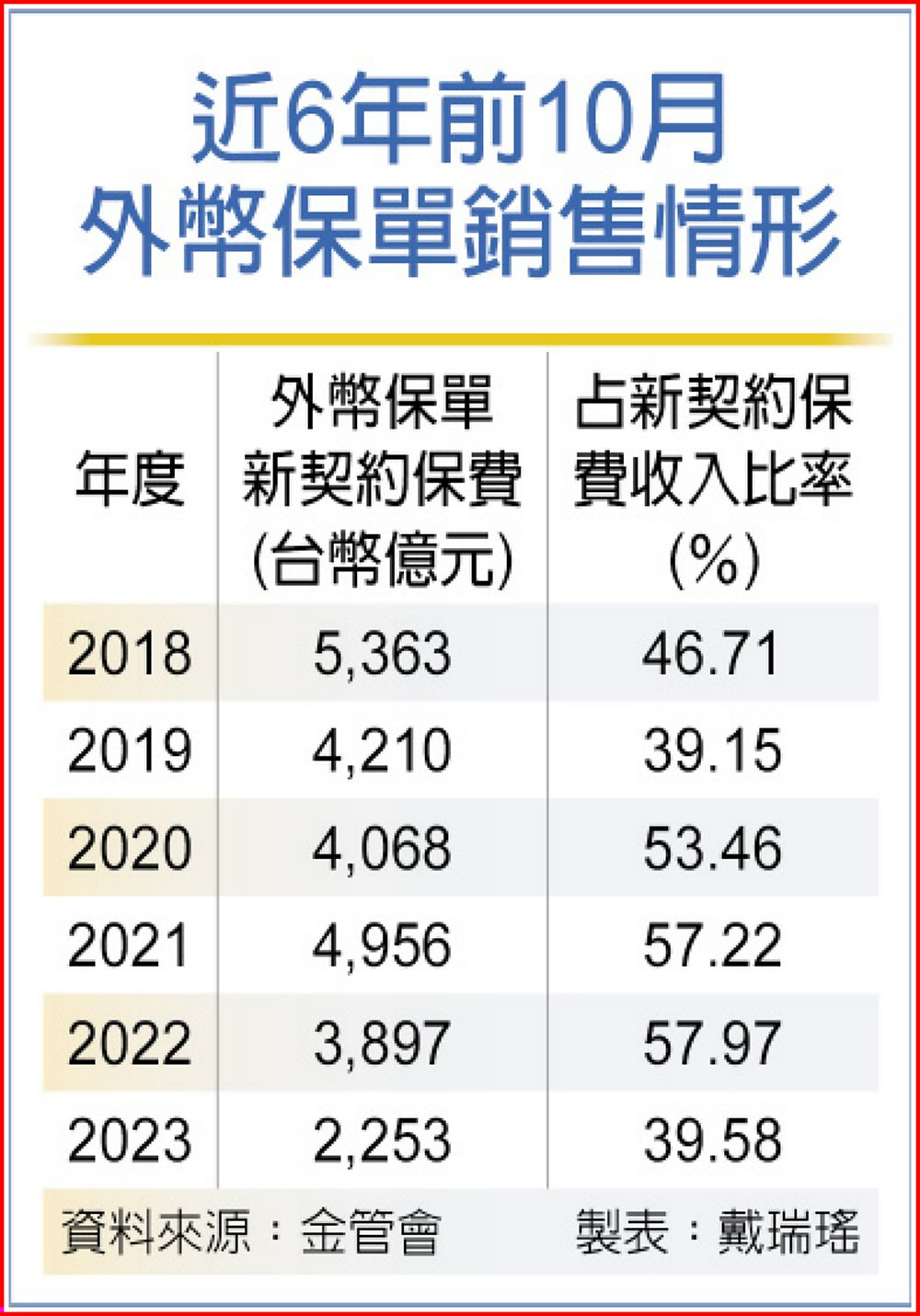 前十月外幣保單新契約保費收入2,253億元,年減1,643億元或42%,其中傳統型賣得比投資型好,傳統型保單前十月銷售1,670億元,相較於去年同期賣2,679億元,年減1,009億元或38%,而投資型前十月僅賣出583億元,不及去年同期賣逾1,218億元,年減高達52%。
