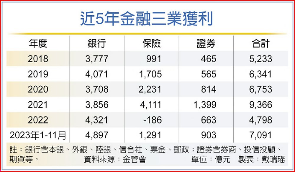 金融業獲利史上新高是2021年的9,366億元,史上次高為2020年的6,753億元,2023年前11月賺7,091億元,雖已超越2020全年史上次高,但12月壽險仍有可能出現虧損,能否守住7,000億仍有變數。