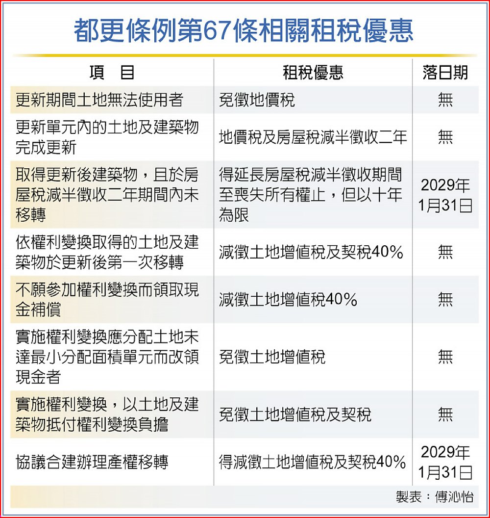 此外,依都更條例,依權利變換取得之土地及建築物,於更新後第一次移轉時,減徵土地增值稅及契稅40%;不願參加權利變換而領取現金補償者,減徵土地增值稅40%,相關條文也沒有到期日。