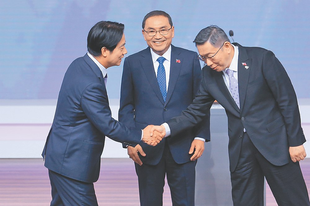 ●2024年總統大選總統候選人辯論會30日舉行,民進黨總統候選人賴清德(左起)、國民黨總統候選人侯友宜、民眾黨總統候選人柯文哲出席,就相關議題相互辯論,3位候選人在辯論會前合影。圖/黃世麒