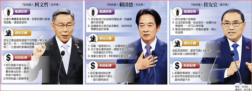 柯文哲則從人口結構認為,未來需要面對很多困難的挑戰,包括少子化、高齡化、勞動力短缺、缺乏願景的經濟等,因此需要勇敢的打造一個公平的環境,讓居住在台灣的人,可以在這塊土地上追求他們的人生夢想。