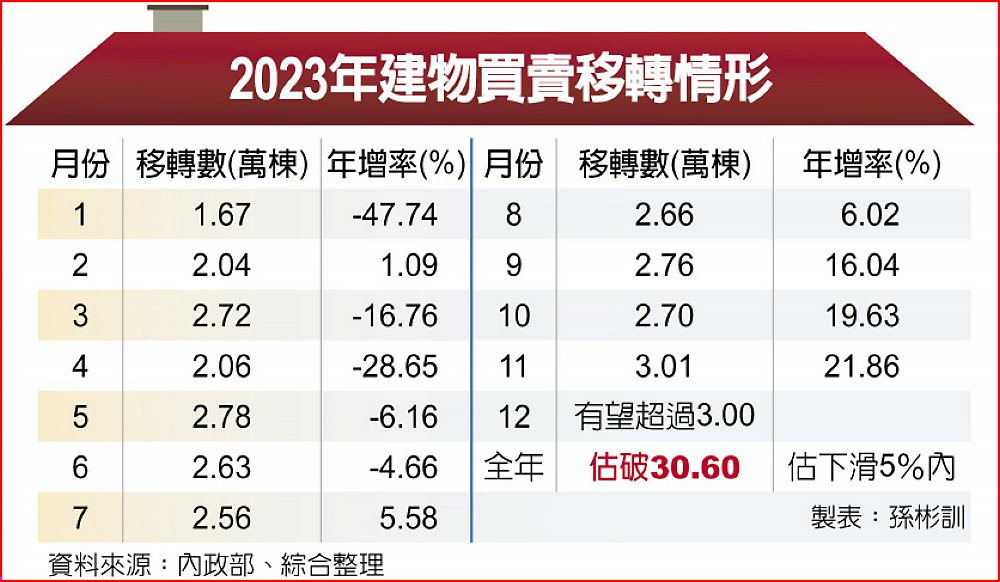 房屋買賣移轉2022年達31.8萬棟、年減8.6%,2023年下半年開始出現年增率轉正,且幅度不斷擴大,到11月年增率達21.86%。公股銀估計,受惠新青安政策及年底前交屋潮,2023年12月可望有3萬棟以上,全年估計約30.6萬棟,年減5%以內。
