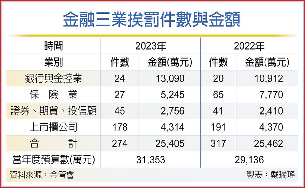 金管會2023年開出274張罰單、罰鍰2.5億元,與2022年相較,件數雖減少43件,但金額與2022年相當、只差57萬元,顯示因加重罰鍰力道,單張罰鍰比2022年高;2023年預算目標3.1億元,達成率約81%。