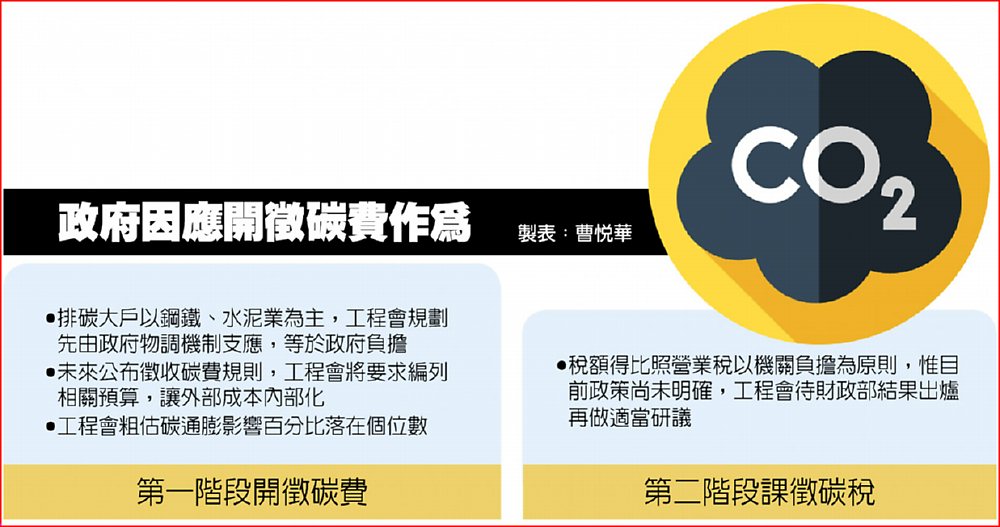 「碳費實施後勢必會造成通膨」。行政院知情人士指出,工程會算出綠色通膨後,就知道課徵碳費對物價嚴重性,也才能知道未來建築被課徵碳費如何因應。除使用物調機制調整,也將思考未來建築興建,如何將碳費反映在設計價格裡。