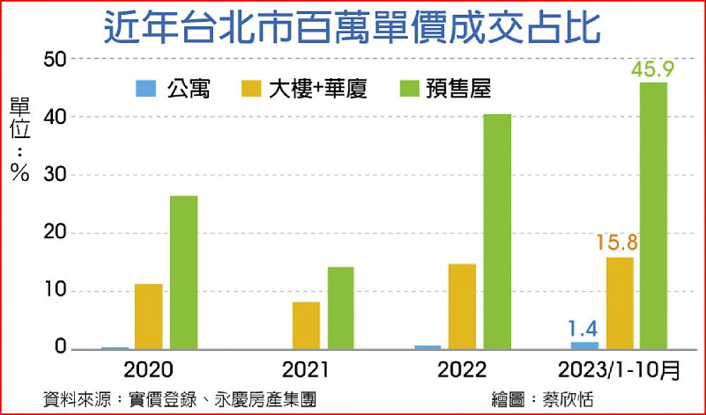 統計顯示,2019~2021年間台北市預售屋百萬單價成交占比僅約2成,不過2022年突破4成,2023年更高達46%。當時百萬單價預售案相當集中在蛋黃五區,除大安區約9成外,其餘信義、松山、中正、中山四區均約在3~4成,蛋白區僅有極零星個案。