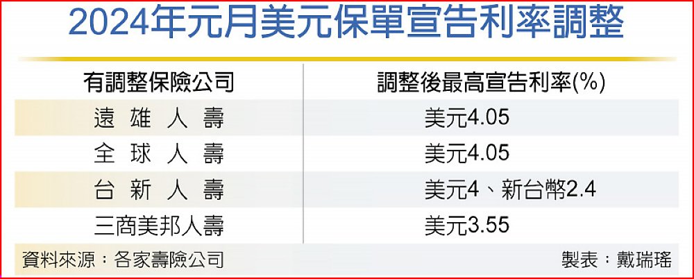 2023年美元保單宣告利率以台灣人壽的4%一路領先,7月到9月雖全球、台新、凱基人壽急追,但皆未突破4%大關,11月遠雄人壽最高才跟進調升到4%,國泰人壽最高拉至3.85%,12月僅元大人壽調升至3.9%。2024年首月遠雄人壽、全球人壽均拉升到4.05%。