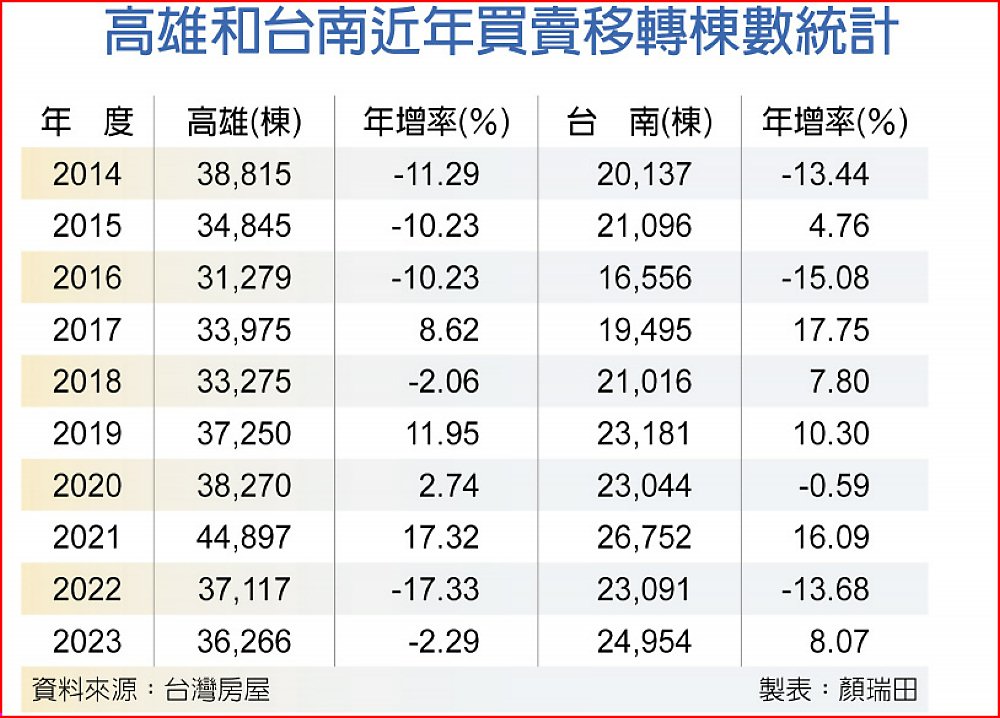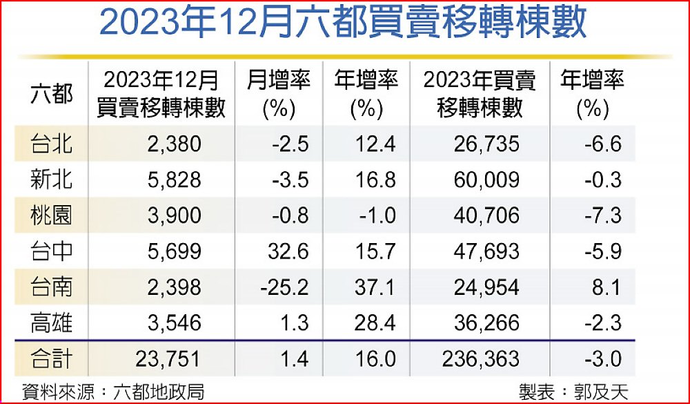 房市經過年底一波拉尾盤,六都2023年全年合計以23.63萬棟封關,下半年年增率連續六個月正成長,全年年增率收歛至3%;以六都來看,台南市在近年推案熱處於交屋高峰期下,推升全年買賣移轉年增8%,其餘五都則各有7%以內的微幅衰退。