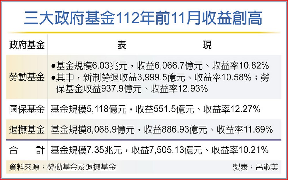 勞動基金、國保基金及退撫基金11月收益數各1,827.9億元、149.5億元、253.85億元,合計前11月收益數各為6,066.7億元、551.5億元、886.93億元,三大基金共大賺7,505.13億元,收益率10.21%;而勞動基金前11月收益數6,066.7億元中,新、舊制勞退基金收益數各3,995.5億元、1,076億元,以及勞保基金937.9億元