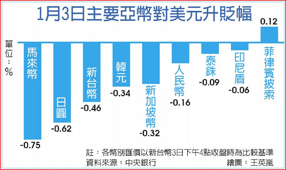 匯銀主管分析,美元再度彈升,反映市場對後續經濟數據的押注,包括稍晚先公布美國聯準會(Fed)會議記錄,後續還有非農就業數據等,且降息預期風向改變,大幅修正樂觀預期,美債殖利率跟著反彈。主要亞幣幾全面走貶,馬來幣重挫0.75%、日圓大跌0.62%、新台幣貶0.46%,其餘亞幣貶0.06%~0.34%。