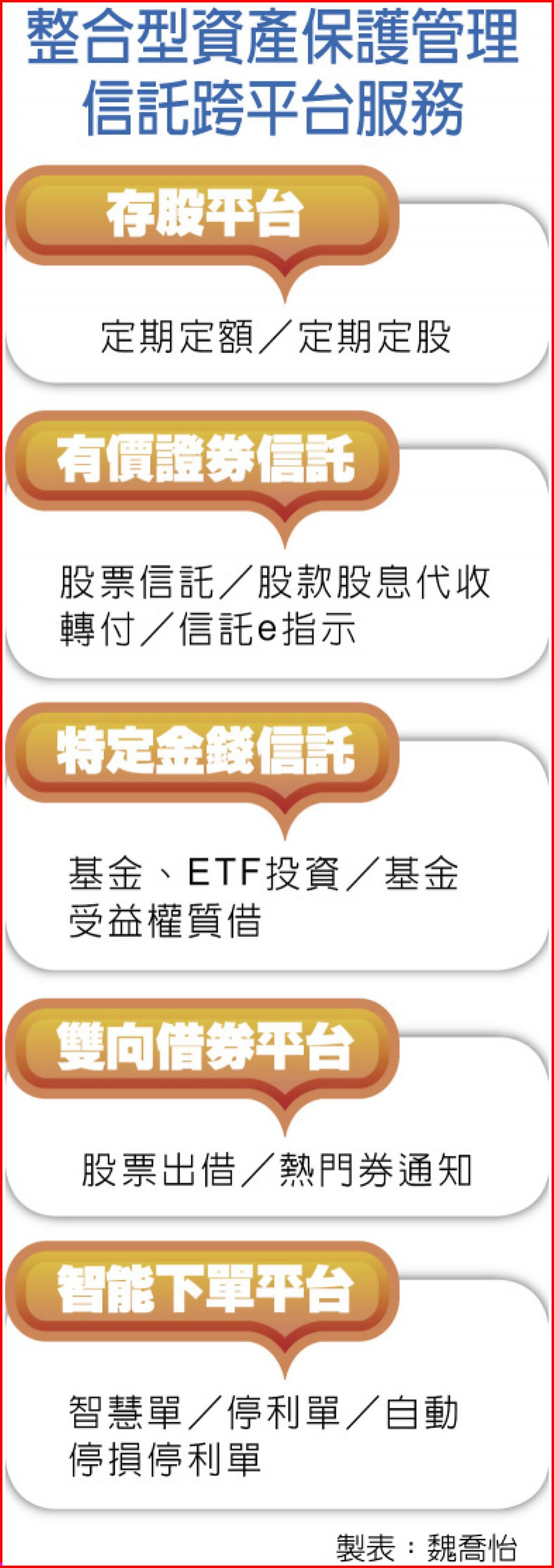 目前唯一推出「整合型財富管理服務模式」為永豐金證券,以股票為核心提供一站式整合服務,包括股票出借可活化長期持股,投資人當股東領股息,也同時能當出借者賺租金;股息定期定額投資基金或布局台美雙市場,讓存股發揮複利效果,且很多功能都可線上指示,省去很多申請或臨櫃時間。