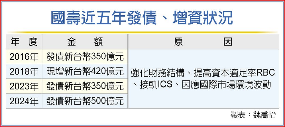 國壽指出,發債金額確實是歷年來最大,國壽近年發債、現增,金額多在350億元上下,如2016年、2023年都是發債350億元、2018年則是現金增資420億元,今年則是規劃發債500億元。不管是發債還是現增原因,不外乎四項「強化財務結構、提高資本適足率RBC、接軌ICS、因應國際市場環境波動」。