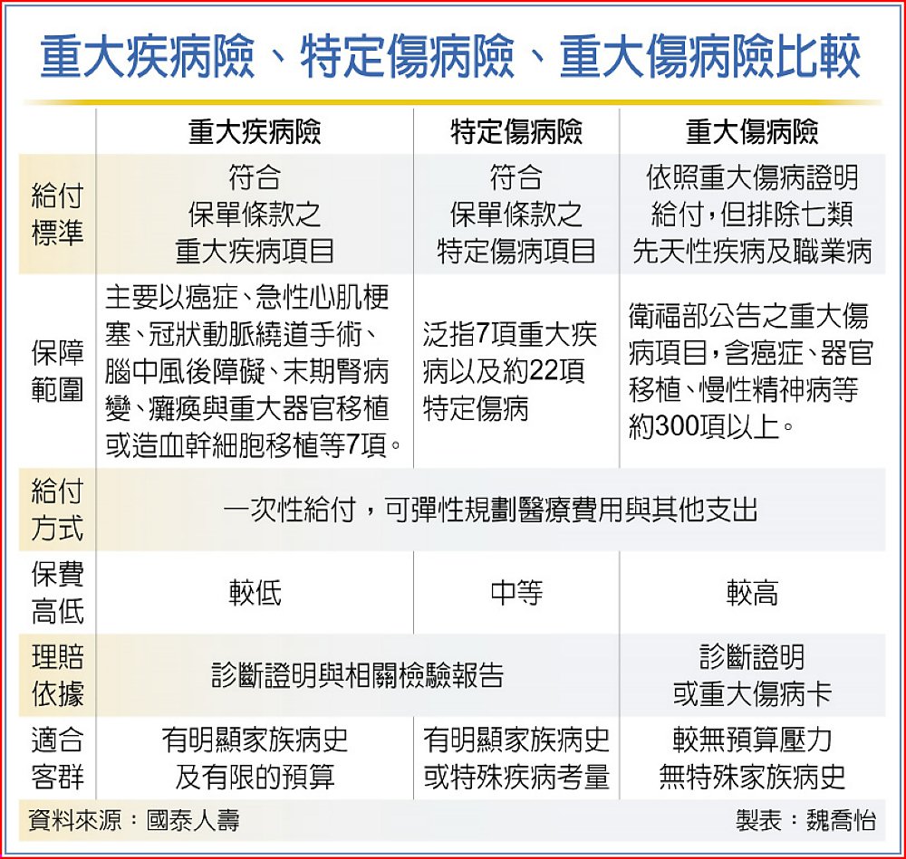 台新人壽認為,重大疾病險、重大傷病險及特定傷病險都是在保障保戶罹患某些嚴重的疾病時,給予一筆保險金給付,協助保戶專心治療或用來補助無法工作之經濟損失。三者的差別在於保障的疾病範圍不同,三種類型商品的給付內容及傷病定義皆有不同,彼此擁有不同的保障範疇,具有互補性,互相無法完全取代。建議可參考家族病史、國人十大死因等,優先選擇能滿足自身較大需求的商品,有餘力時可逐步加強完整保障。