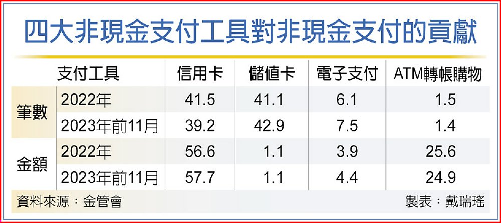 據銀行局統計,2023年11月底,非現金支付金額達6.66兆元,全年可達7.26兆元,年成長17.7%,超過目標的6兆元;但11月底交易筆數為62.62億筆,全年可達68.32億筆,年成長25.17%,但與目標78億筆,達標率僅為87.22%,即是捷運等儲值卡交易筆數大減造成。