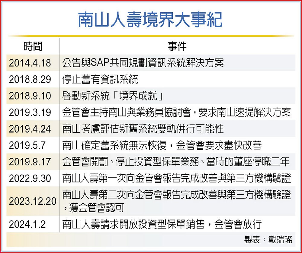 南山人壽兩度向金管會報告,第一次是2022年9月30日,但金管會認為系統仍有問題,要求再進行改善,第三機構也要持續驗證;第二次是2023年12月20日南山再次報告,當初投資型保單系統的投資標的誤植、帳單錯誤等問題,都已改善,也經第三方機構驗證,金管會認可其完成改善,因此解禁。