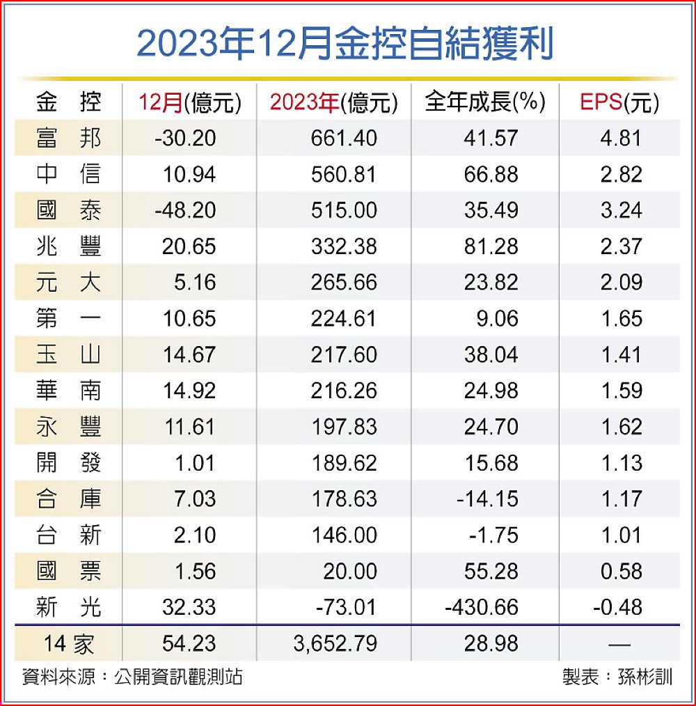 國泰金控因子公司國泰人壽去年匯兌成本較重、且實現較少資本利得,全年金控稅後獲利515億元,排名第三,但亦較2022年時獲利成長逾35%,EPS則為3.24元,排名金控第二。