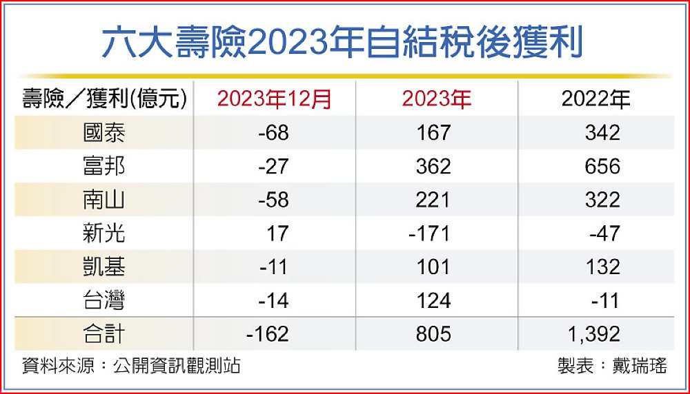 六大壽險12月合計稅後虧損近162億元,原本前十月累積獲利已達到1,335億元,在最後兩個月大虧下,最終全年稅後淨利804.8億元,年減42%。
