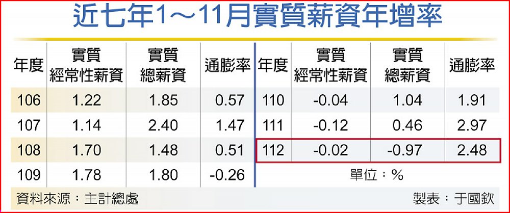 國勢普查處副處長陳惠欣表示,去年受出口疲弱及前一年高基期的影響,名目薪資成長率不如前一年,加以物價漲幅偏高,這兩個因素導致實質薪資負成長,調查顯示,去年1~11月經常性薪資、總薪資的名目年增率為2.45%、1.47%,經物價指數(CPI)平減後的實質年增率轉為-0.02%、-0.97%。