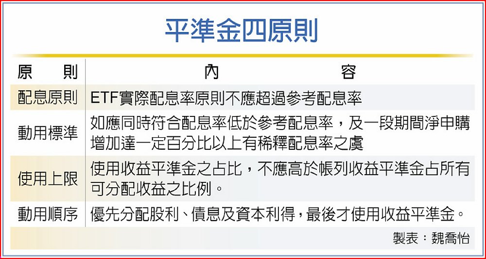 ETF使用收益平準金配息,不應高於帳列平準金占比,黃厚銘解釋,收益平準金顧名思義就是要有收益,假設可分配的收益是1,000萬元,收益平準金配息就不可高於1000萬元的一定比例。
