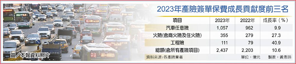 產險簽單保費從2021年突破2千億元大關後,之後每年以200億餘元金額持續向上衝高,據產險業統計,2023年簽單保費達2,437億元,較2022年增加234億元,成長10.6%的歷史新高成長率,保費創新高貢獻最多的是車險,汽車任意險保費在2023年突破千億元大關,達1,056.67億元,單年增加95億元,更創下9.9%的超高成長率。