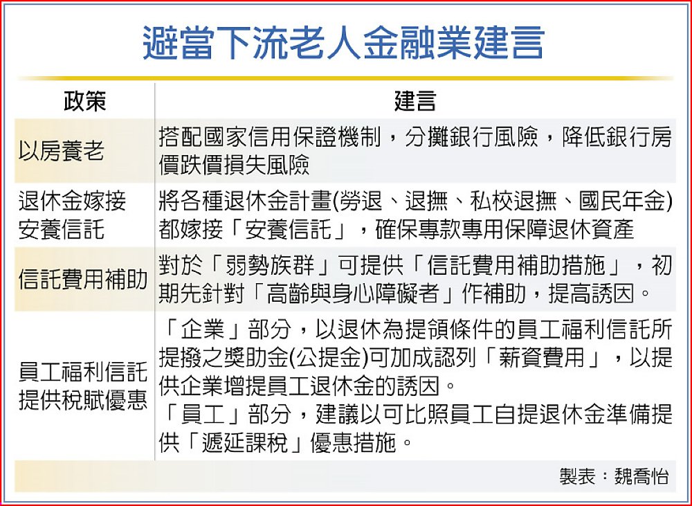 若想要避免國人淪為沒錢沒房的「下流老人」,信託公會也獻策三招。一是鼓勵民眾將各種退休金計畫(如勞退、國民年金)都嫁接「安養信託」,由受託機構依照信託契約,按照民眾所想要的方式管理。