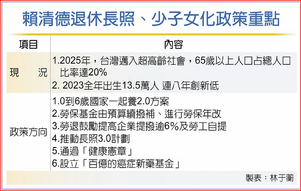 至於少子女化問題,賴清德打出0到6歲國家一起養2.0方案,措施包括0到3歲家外送托率提高到OECD國家36%水準;增加0到2歲托育費用補助,第一胎公托補助提升至7000元,準公共托嬰及保母服務補助提升至1萬3000元;實施彈性育嬰假。另外,高中職也將全面免學費,取消補助收入門檻限制。
