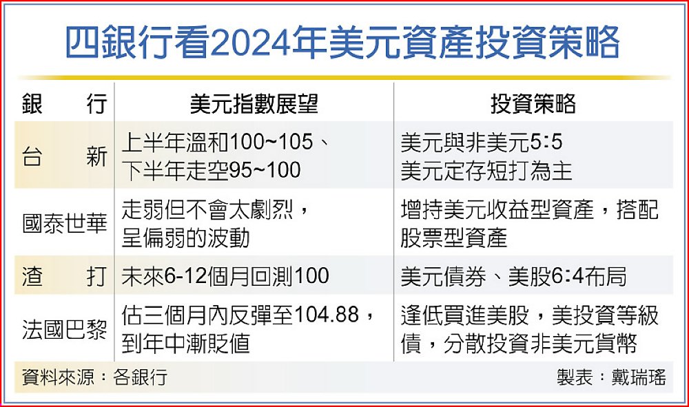 國泰世華銀行也分析,美元今年會較去年疲弱,因聯準會準備降息,會讓美元吸引力減少,但預期美元貶幅不會太劇烈,因歐元區也準備降息,壓抑了歐元升值空間。現階段國銀一年期美元定存利率平均值約落在4%,考量美元將走弱,單純換美元作定存的潛在報酬有限,建議採兩做法,一是不以一年期間為限,並增持其他美元收益型資產,像是美元計價投資等級債;二是搭配具有競爭力的美股票型資產。