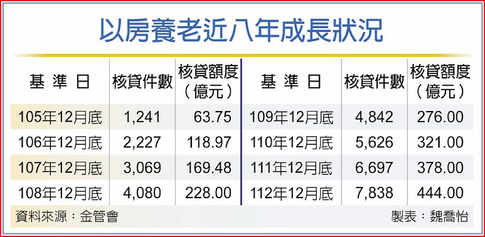 金管會指出,2023年雖然美國聯準會持續升息,但以房養老貸款業務仍穩定成長。截至去年12月底止,國內15家銀行辦理商業型以房養老貸款業務承作件數計7,838件,總核貸額度為新台幣444億元,較2022年底分別成長17.04%、17.46%,仍維持穩定成長。