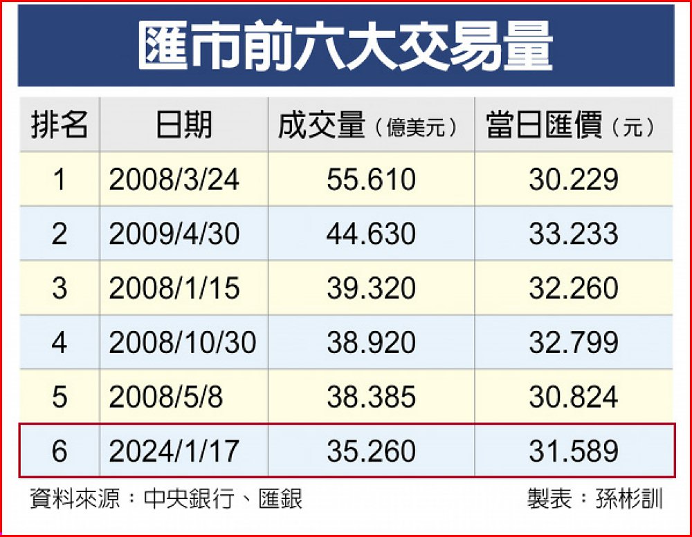 盤中一度重貶至31.625元,狂洩2.33角,外資匯出力道龐大,匯市成交量爆出35.26億美元巨量,創2008年5月以來、逾15年半單日最大量,為史上第六大量,更是金融海嘯以來的單日最大量。