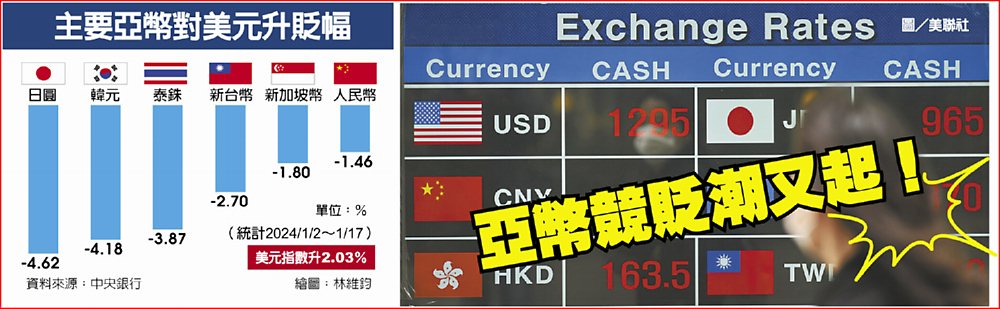 央行發文指出,美元為國際主要準備貨幣,美國聯準會(Fed)貨幣政策立場除影響美元利率外,也會影響美元走勢,如16日Fed理事Christopher Waller表示因美國經濟表現不錯,通膨緩慢朝政策目標下滑,未來Fed不必像以前快速降息。加上紅海事件影響運費,市場通膨疑慮略增,16日10年期美國公債殖利率上揚12個基本點(美債價格下跌),美元指數(DXY)續強,美股三大指數下跌,拖累17日亞洲股市續跌,主要亞幣對美元匯率多呈現貶值。