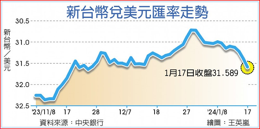 央行強調,2023年11及12月市場樂觀預期Fed將降息,美元指數快速走弱,新台幣對美元由2023年11月1日32.484元,累升5.69%至2023年底的30.735元,但今年以來受到國際美元走強影響,新台幣對美元貶幅看起來雖很大,至17日新台幣匯率31.589元,但與2023年11月1日相比還是升值2.83%。