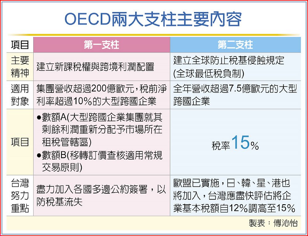 不過,會計師公會全聯會也表示,OECD提出的兩項支柱,還是有部分需要釋義且尚未最終確認,其中最值得注意的是,美國目前有較多適用第一支柱數額A的跨國企業,美國國會對相關規範的核准程序,將是觀察關鍵。