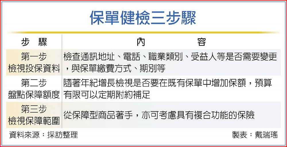 第三步是檢視保障範圍。宏泰人壽表示,由於國人對健康議題的格外重視,因此保單範圍的健檢,可先從保障型商品著手,從保單條款、給付項目檢視既有的保單是否已經面面俱到,或是特定險種,例如實支實付險、失智險、重大疾病險、長期照顧險需不需要額外加強,或是主約再多補足有需要的附約等。